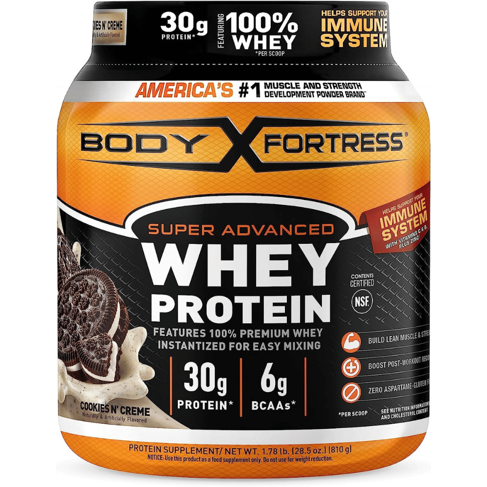 The Body Fortress Super Advanced Whey Protein Powder in Cookies N’ Crème flavor is a must-have for any serious athlete. Packed with 30 grams of protein and 6 grams of BCAA's per serving, this formula helps you train harder and rebuild lean muscle faster. It's perfect as a pre or post-workout boost, or as an anytime snack to meet your daily protein needs. Plus, with added vitamins and zinc, it supports your immune system so you can stay healthy and strong. And with its deliciously creamy Cookies N’ Crème flavor, you'll actually enjoy drinking it! Whether you're a gym rat or just starting your fitness journey, Body Fortress Super Advanced Whey Protein Powder is a great choice for anyone looking to fuel their body with the best.