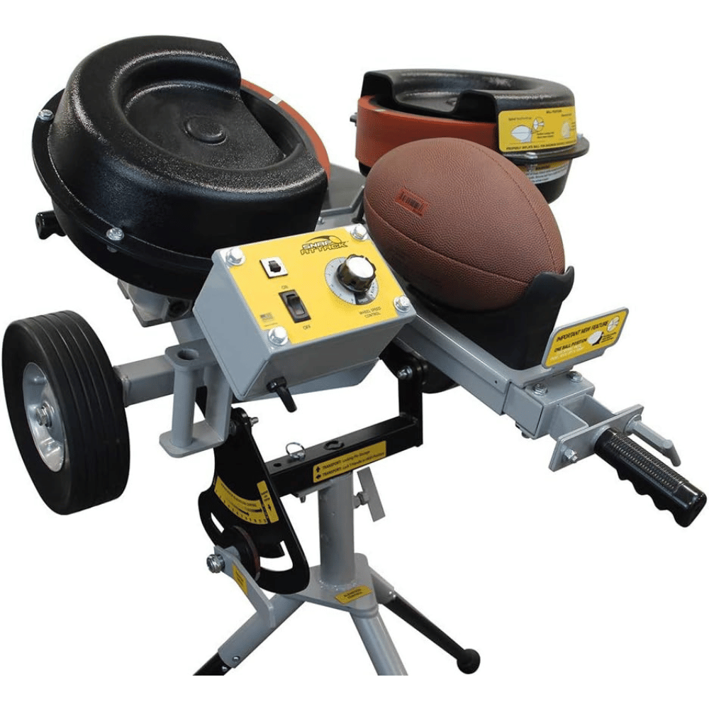 The Snap Attack Football Machine helps maximize your time on the most difficult to practice phases of the game. This machine features a universal cradle that positions the ball for either passing, punting, snapping or kick-offs, so you don't need a second cradle for kick-off. It also has two high-powered motors that provide instant recovery and allow for rapid repetition and combination of drills with no waiting for wheels to come back up. The passing stand allows the throwing head to pivot instantly in any direction, so you can accurately throw passes, punts and kick-offs to any location on the field. And it's designed with solid polyurethane football wheels that provide tight spiral, long distance and accuracy while minimizing marking and wearing of balls - all without needing air pressure! Plus, when lowered down at ground level at realistic angles, this machine snaps ball to any depth in shotgun and pistol formations, extra points and punts.