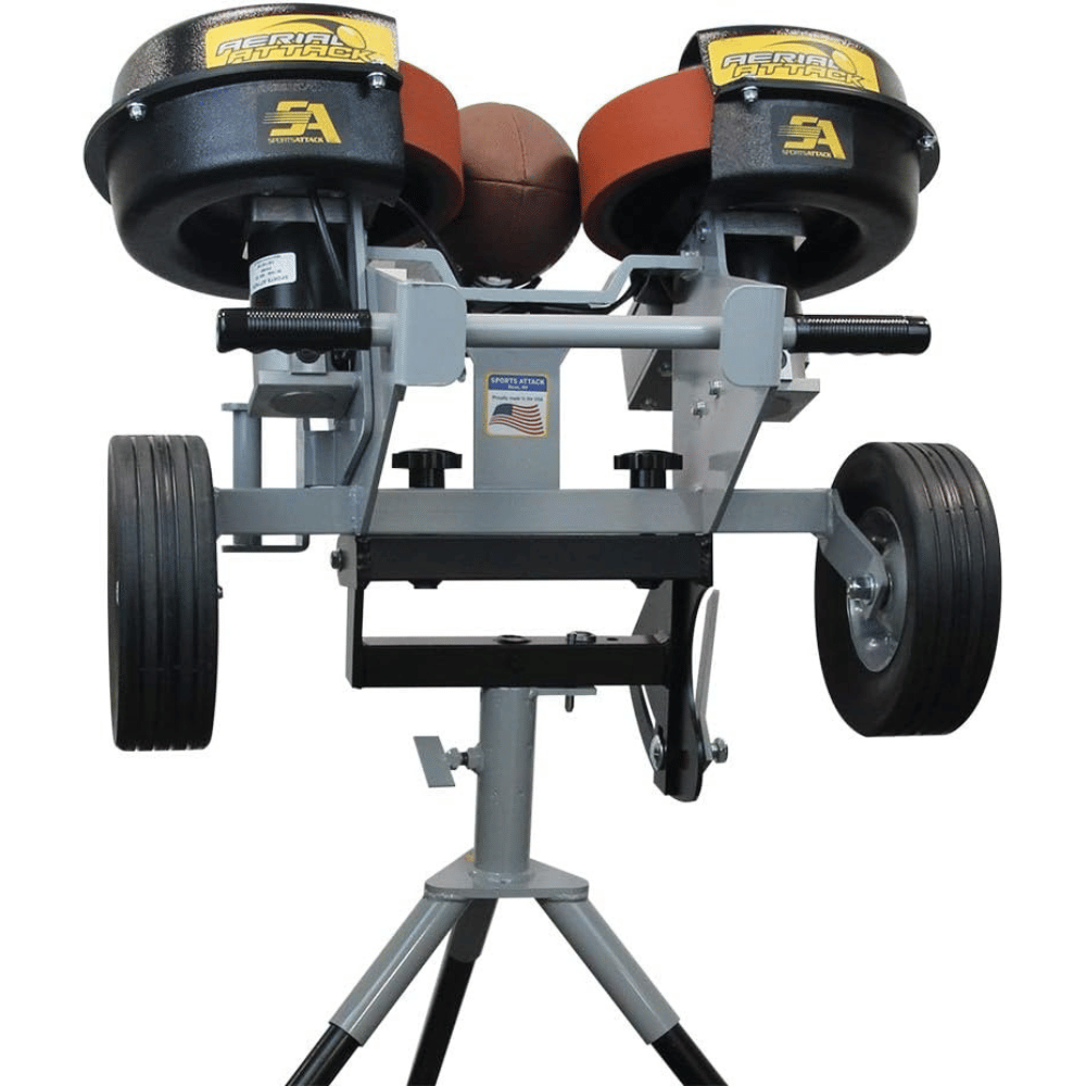 The Sports Attack Football Machine is the perfect tool for football programs on a tight budget. Designed to deliver right-footed deep spiral punts that turn over and end-over-end kick-offs for coverage and return practice, this machine also throws both long and short passes for receiving and defensive drills. With its ability to pivot in any direction and to instantly throw to an exact location, the Sports Attack Football Machine provides the challenge that every team needs to improve. And with its universal cradle that positions the ball for passing, punting, or kick-offs, it is a versatile tool for any team. With two high-powered motors that provide instant recovery, there is no waiting for wheels to come back up to speed. And operators can lead receivers or spot punts or kick-offs precisely for both returns and coverage.