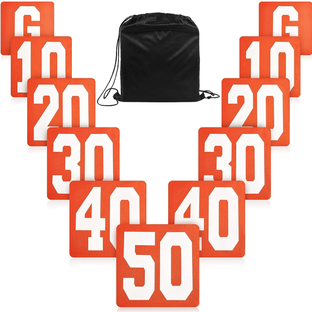 Take your football games and drills to the next level with the GoSports Football Field Yardage Markers. The set of 11 sand weighted yard markers is sufficient for covering one side of the field. Made from extremely durable weather-resistant vinyl with thick foam padding for improved player safety, you won't have to worry about anyone making contact with the markers. And don't worry about them blowing away in windy conditions either, as each marker weighs 2 lbs and measures 12.5 in x 12.5 in. With the two (G), two (10), two (20), two (30), two (40), and one (50) markers, you'll have everything you need for your football game or drills. Plus, the markers are bright enough to see and clear to read the numbers, so you won't be left guessing where you're standing. With their anchorless sand weighted design, you'll find they are really well built and sturdy—perfect for younger band members to know their place on the field.