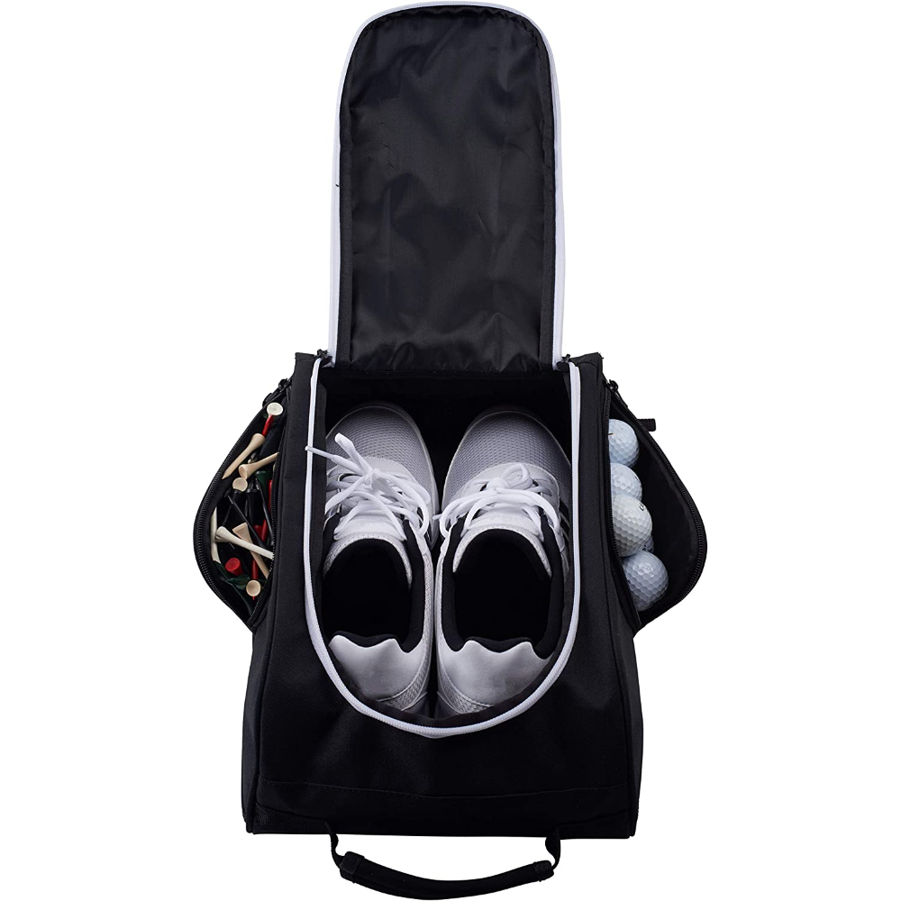 The Golkcurx Golf Shoe Bag is a great option for storing your golf shoes. It fits up to shoes size 14 for men and 15 for women, and is made of premium 600D heavy-duty polyester oxford, making it durable and not easy to tear. The bag also features padded handles for easy carrying, as well as two side accessory pockets perfect for storing socks, tees, or golf balls. Plus, the bag has a durable zipper and breathable mesh paneling to keep shoes fresh and aired out. All in all, the Golkcurx Golf Shoe Bag is a great option for those looking for an affordable and functional golf shoe bag.