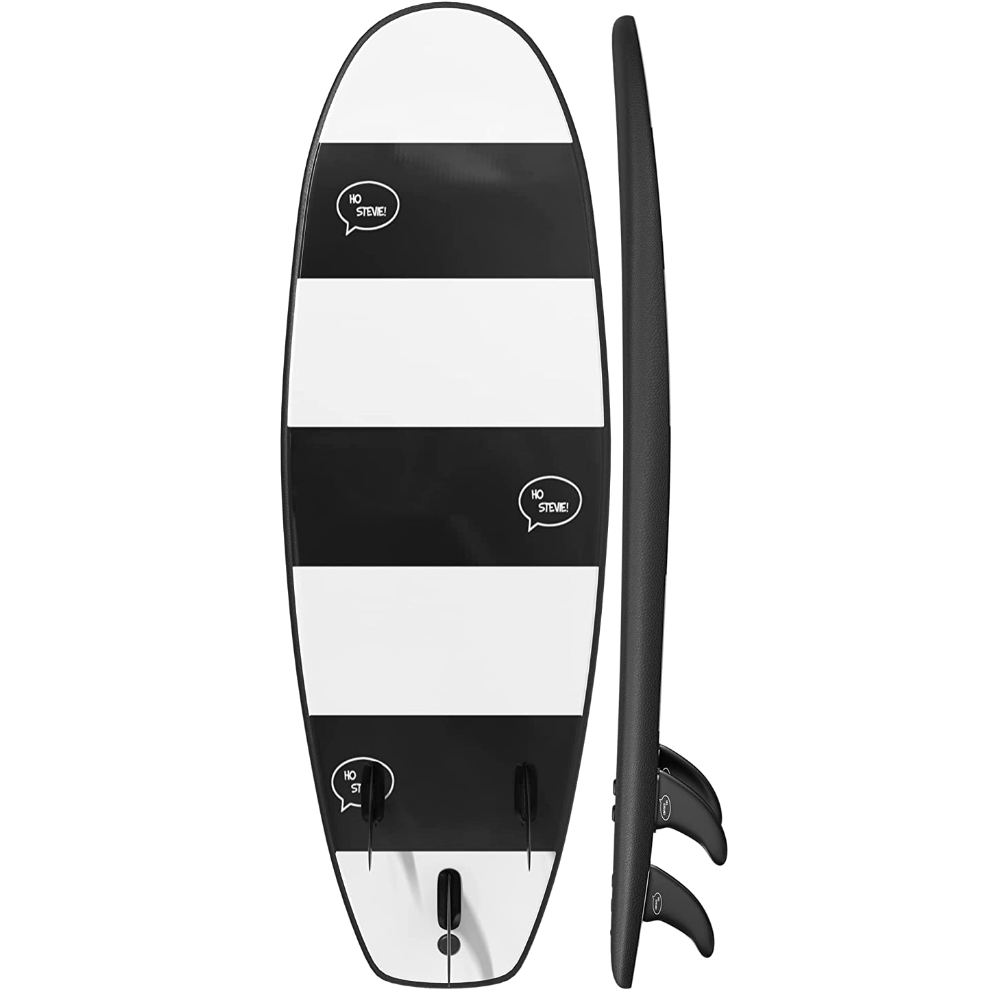 Riding the waves has never been more exciting with the Ho StevieSoft Top Shortboard Surfboard. Unlike other foamie surfboards, this one is designed like a classic fiberglass surfboard but with the added soft top layer for a comfortable ride. With the square tail, you can go faster and have a much looser feeling, which makes it perfect for those who want perform some impressive carves and turns. The top layer is made of "ALLIGATOR SKIN" material, which is soft and grippy, eliminating the need for wax. The black and white striped bottom ensures a clean and classic look. The triple stringers and fiberglass cloth (two on top and one at the bottom) with epoxy resin make this shortboard surfboard extremely durable. Get ready to ride the waves with this unique and reliable surfboard.
