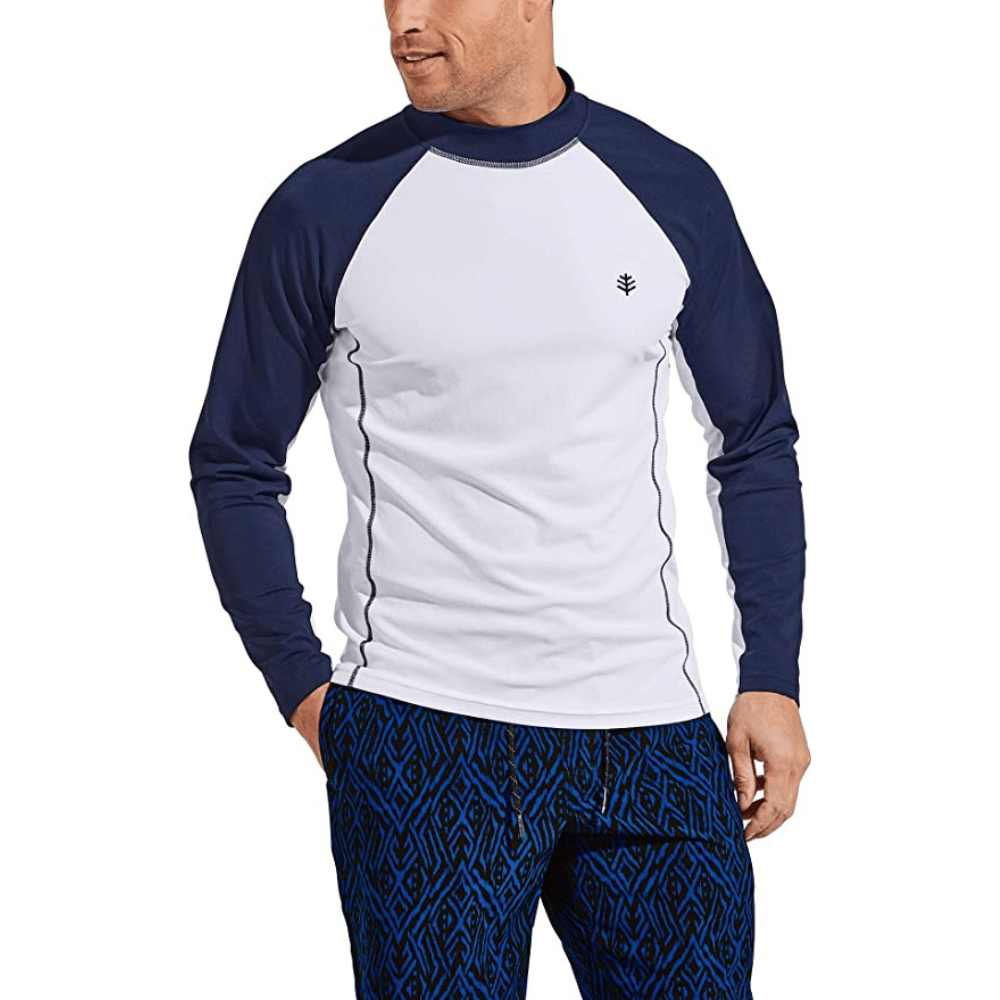 The Coolibar UPF 50+ Tulum Long Sleeve Shirt is the ideal wet suit shirt for any outdoor enthusiast! As a UPF 50+ garment, this surf rash guard effectively blocks 98% of harmful UV rays – no worries about sunburn! It's also chlorine- and saltwater-resistant, making it an ideal companion on your beach or swimming excursions. Cut for comfort with our outstanding Aqua Classic fabric, you can trust in the quality and durability of this men's long sleeve surf rash guard. Enjoy spending time outdoors without having to worry about managing the sun – get your Coolibar UPF 50+ Tulum Long Sleeve Shirt today!