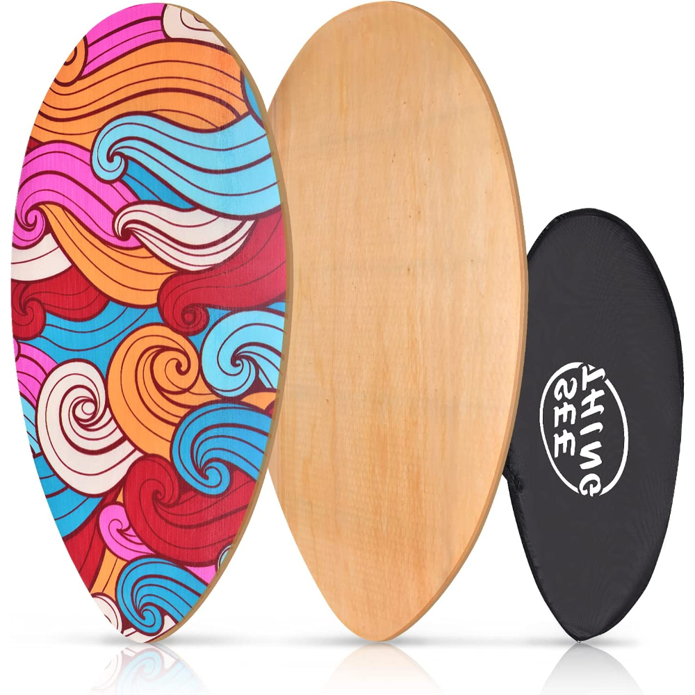 Wood skimboards come in various shapes and sizes, catering to different skill levels and riding styles. Beginners may prefer a wider, more stable board, while advanced riders can opt for a more tapered design for better maneuverability. The type of wood used impacts the board's durability, flex, and weight. High-quality boards often use marine-grade plywood or solid hardwoods like bamboo and maple. Look for boards with a grip-enhancing surface such as foam or wax, as it provides better control and stability while riding. Some wood skimboards feature fins for improved tracking and turning capabilities, while others have a finless design for a more forgiving ride. Your choice of wood skimboard should also depend on the water conditions you'll be encountering. Flatland skimboarding requires a different board design than wave riding. Wood skimboards typically require more maintenance than foam skimboards, including regular sealing or varnishing to prevent water damage.